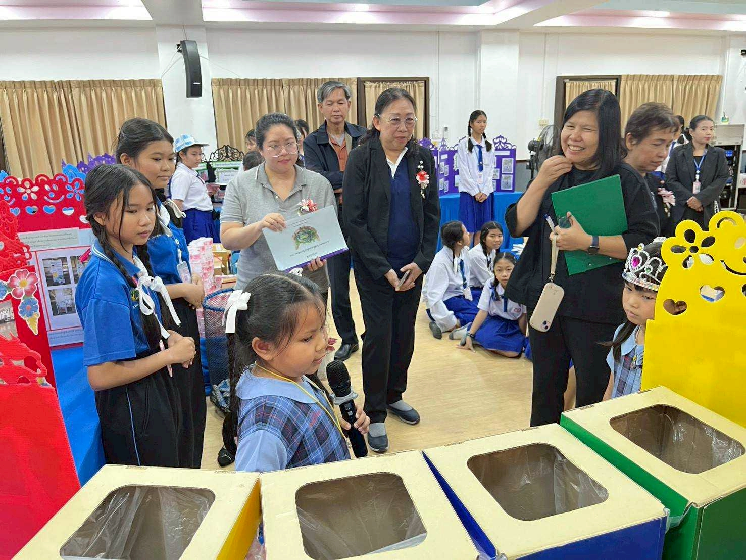 นักเรียนได้นำเสนอการดำเนินกิจกรรมด้านการอนุรักษ์สิ่งแวดล้อมที่ได้ดำเนินการภายในโรงเรียน พร้อมทั้งพาคณะกรรมการเยี่ยมชมจุดคัดแยกขยะบริเวณโรงอาหาร จุดตัดล้างถุงนมเพื่อนำมาประดิษฐ์เป็นผลงานต่าง ๆ แปลงเกษตร และบรรยากาศการจัดการสิ่งแวดล้อมภายในพื้นที่โรงเรียน
