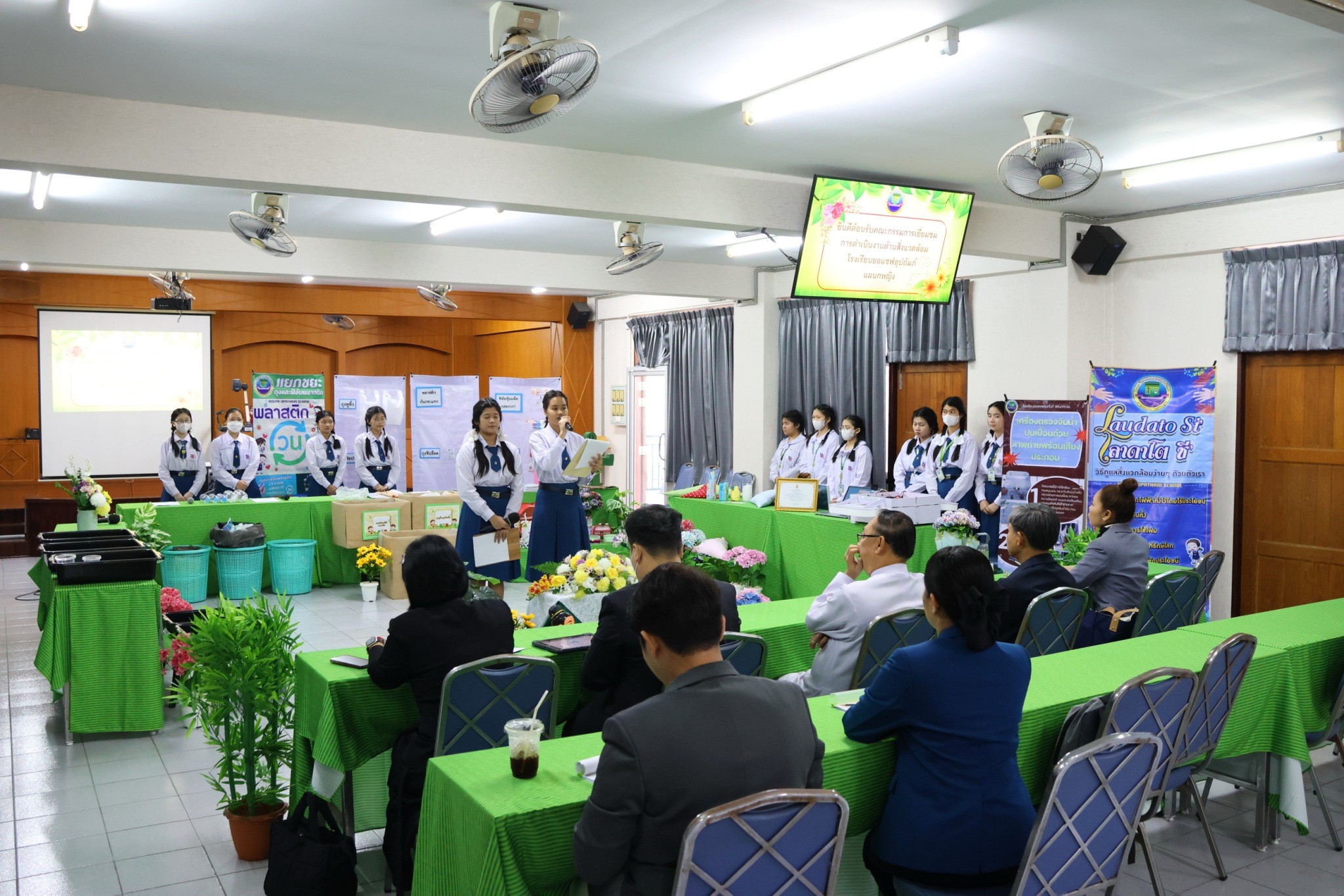 นักเรียนได้นำเสนอการดำเนินกิจกรรมด้านการอนุรักษ์สิ่งแวดล้อมที่ได้ดำเนินการภายในโรงเรียน ณ ห้องประชุม พร้อมทั้งมีการแสดงของนักเรียน จากนั้นได้นำคณะกรรมการเยี่ยมชมห้องเรียนนักเรียน