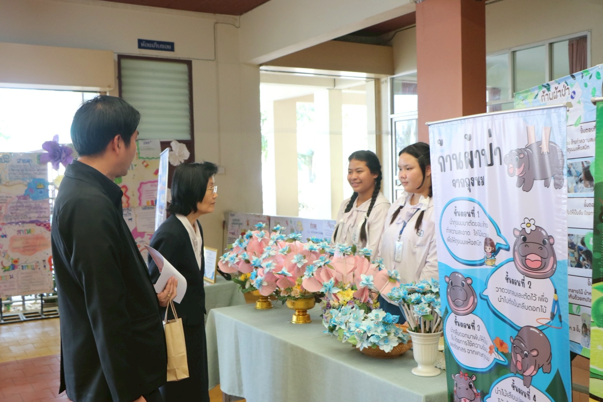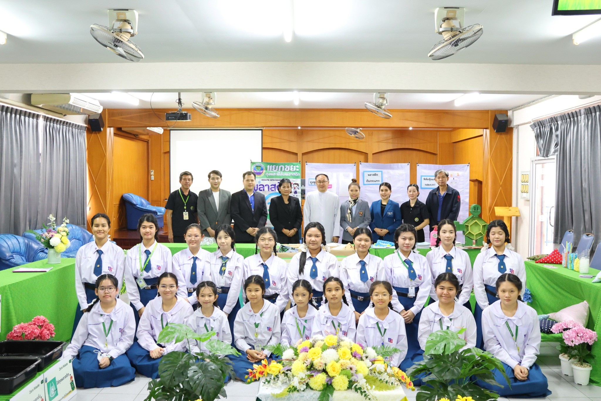 นักเรียนได้นำเสนอการดำเนินกิจกรรมด้านการอนุรักษ์สิ่งแวดล้อมที่ได้ดำเนินการภายในโรงเรียน ณ ห้องประชุม พร้อมจัดบูทกิจกรรมต่าง ๆ อาทิ การทำพวงกุญแจจากฝาขวดน้ำ การทำกระถางต้นไม้จากโฟมผสมปูน การทำสร้อยข้อมือ การนำเสนอการตรวจห้องเรียนด้านการใช้พลังงานโดยใช้ Google Form การคัดแยกกระดาษเหลือใช้ และผลงานสิ่งประดิษฐ์ต่าง ๆ ของนักเรียน