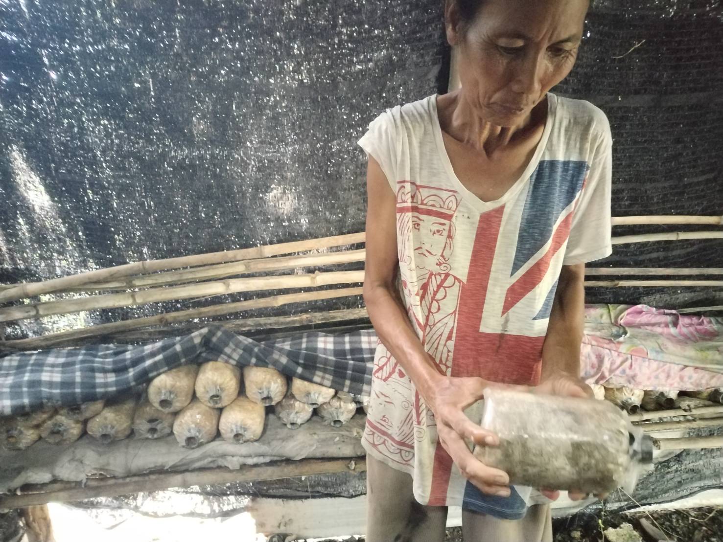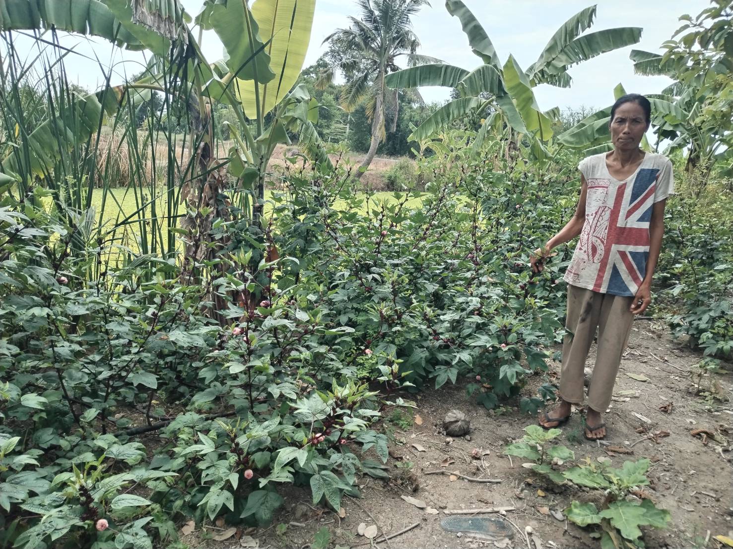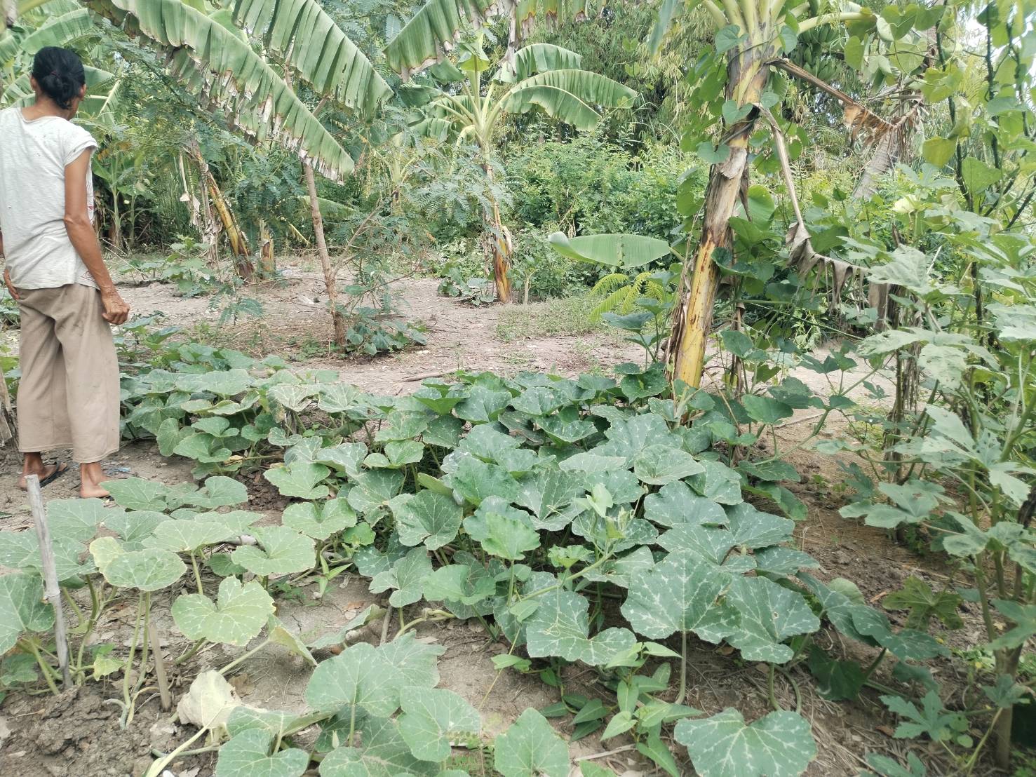 ส่วน คุณปรานี ชาวขมิ้น ที่ได้รับสนับสนุนทุนอาชีพจำนวน 4,000 บาทเพื่อทำอาชีพเพาะเห็ด ประสบปัญหาเรื่องสภาพอากาศ เห็ดไม่ออกดอกตามเป้าหมายที่คิดไว้ ส่วนการทำเกษตรครัวเรือนที่เคยไปแนะนำไว้ ตอนนี้ผลผลิต เช่น กล้วย ฟักทอง มะเขือพวง บวมหอม ฯลฯ เริ่มมีผลผลิต สร้างรายได้เพิ่มอีกทางหนึ่ง ส่วนไก่บ้านจำนวน 50 กว่าตัวที่เลี้ยงไว้ ออกไข่ให้เก็บขายได้ทุกวัน ไก่เป็นขายเป็นกิโลๆ ละ 100 บาท คนในพื้นที่ก็สนใจมาซื้อผลผลิตต่างๆ ถึงบ้าน